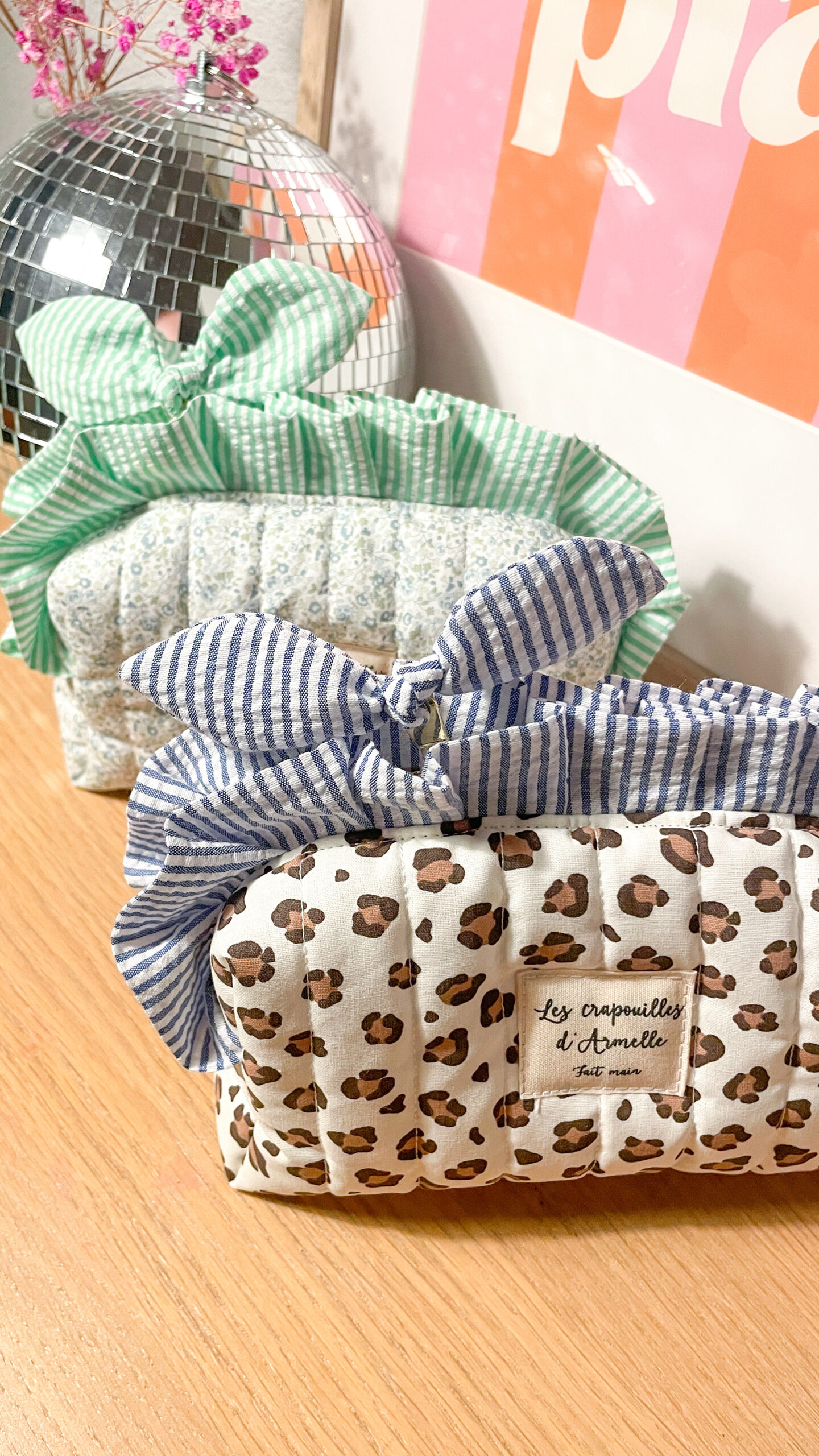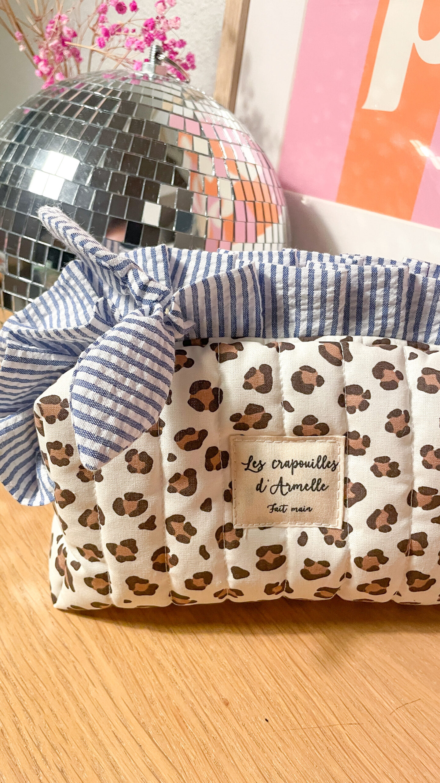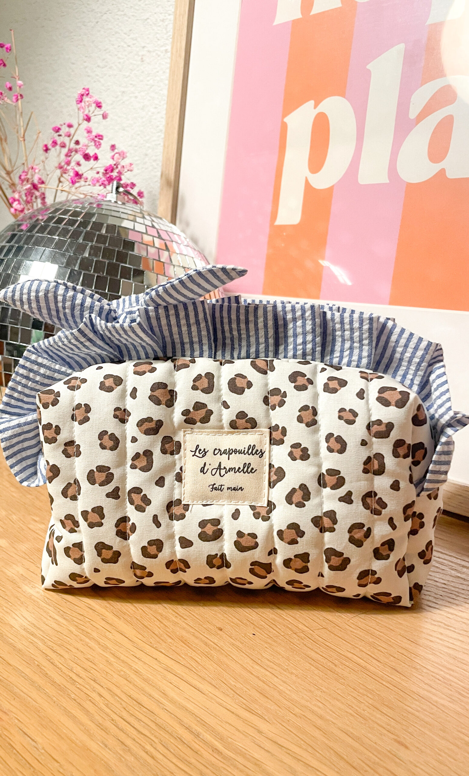 Trousse à maquillage matelassée à volant léopard et rayée
